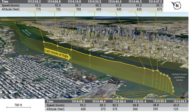 The helicopter passed the George Washington Bridge, then did a U-turn, and headed south along the New Jersey side of the river. It was at an altitude of approximately 620-650 feet as it approached the Holland Tunnel ventilation towers near Jersey City.