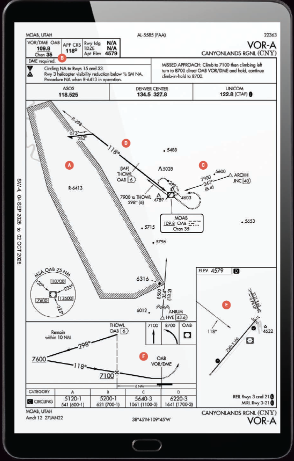 A pilot might choose to get established on this approach by using the OAB VOR as an initial approach point. But there is another hint on this approach that might be of use. You can also see the “ARCHH” waypoint note to the east of the airport with an arrow pointing toward the OAB VOR. This is an indication that the waypoint is a point along a Victor airway in this case and from which a pilot might transition off the Victor to the OAB VOR to start the approach. If you look at a low-altitude en-route chart, you will find this along “V8,” where a pilot would have a minimum en route altitude (MEA) of 10,000 feet msl. If they had been flying from the Grand Junction, Colorado, VOR (JNC) southwest bound along the 232 radial, this point could be used to then transition to the OAB VOR and get established on the approach.