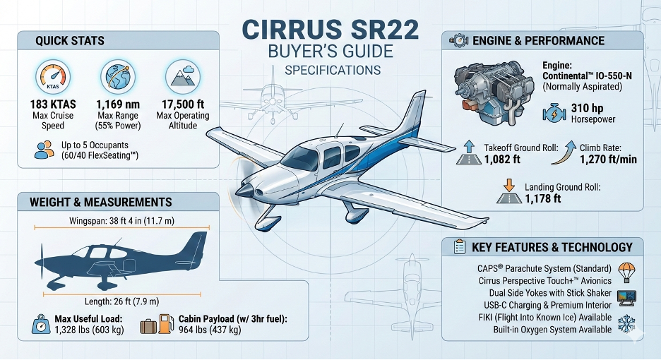 This comprehensive buyer’s guide examines the SR22’s evolution from G3 through G7+ generations, analyzes 2023-26 National Transportation Safety Board (NTSB) accident data revealing pilot decision making as the predominant accident factor, details maintenance costs including $13,000-$16,000 CAPS repacks, and provides current market valuations ranging from $265,000 for entry-level G3 models to $1.2 million for new G7+ SR22T aircraft. Key 2026 updates include Cirrus Global Connect with automatic five-minute weather updates, four-blade composite propeller options, and USB-C ports supporting Starlink connectivity.