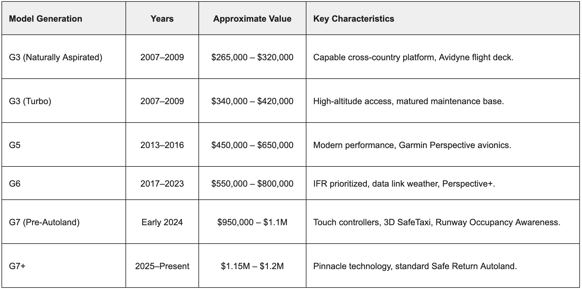 G3 models (2007-09): Naturally aspirated aircraft with approximately 1,500 hours represent the entry tier at $265,000–$320,000, offering capable transportation for budget-conscious buyers willing to accept older avionics and the original Avidyne-based flight deck. G3 Turbo variants command $340,000–$420,000, reflecting the performance premium associated with high-altitude capability. These aircraft benefit from the matured maintenance knowledge base accumulated over nearly two decades of service.