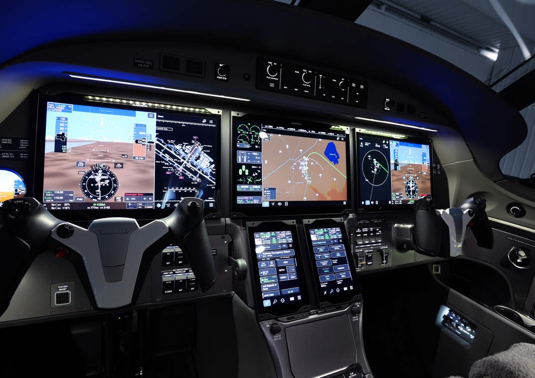 The Garmin touch control panel has three 14-inch screens (two Primary Flight Windows and one Multifunction Window) and two 7-inch screens—the Secondary Display Units (SDUs) for data entry and system control. All screens are very high resolution and easy to read in any lighting condition. They can be controlled by touch or the CCD. Anti/deice controls are to the left of the center console, with pressurization controls to the right.