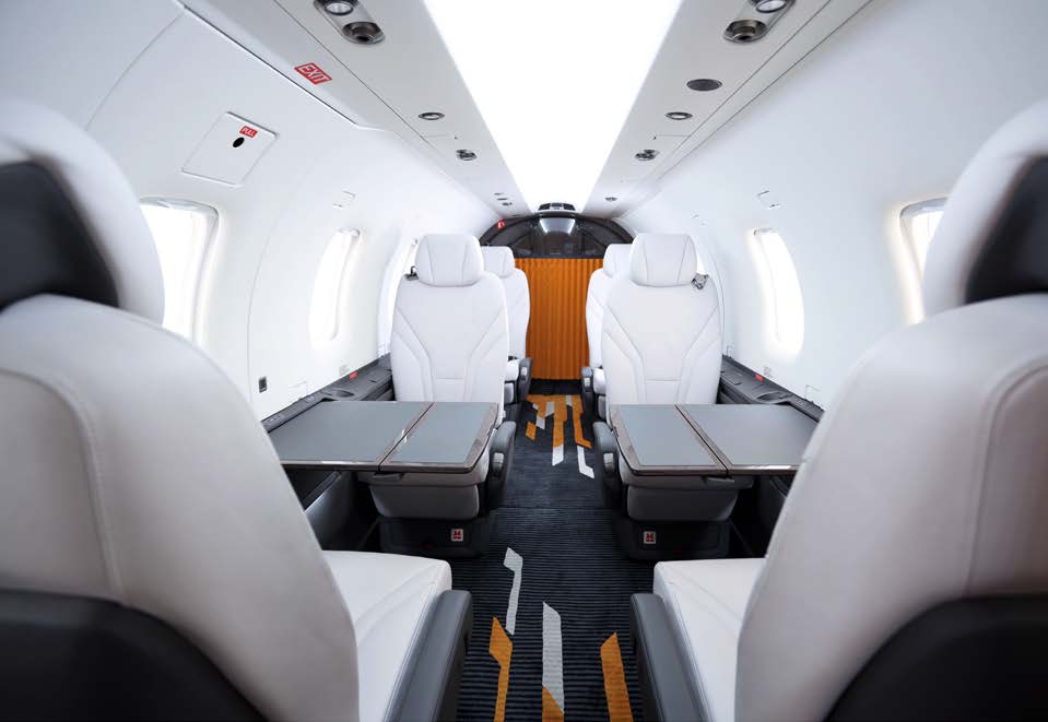 As might be expected from an airplane in this class, the cabin furnishing from BMW Designworks is rich, yet not overstated. The seats can lie flat, cabin lighting has been upgraded, and USB ports and power outlets are near each seat. Up to nine seats in commuter configuration can be installed, allowing for 10 passengers—one in the copilot seat. The most common configuration is six cabin seats with the front four in a club seating arrangement.