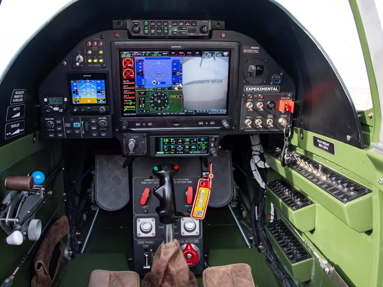 The SW-51 is a Garmin airplane with three options for the front and rear instrument panels—silver, gold, and platinum. The silver panel included a 7-inch G3X Touch, analogue backup instruments, Trig TY91 radio, and choice of transponders. The gold panel moves up to a 10-inch G3X Touch and G5 along with a Trig TY91 radio and transponder choice. The platinum panel features a 10-inch G3X Touch, G5, GNX375 with transponder, Garmin 245 audio panel, G507 autopilot, and Trig TY91 radio.