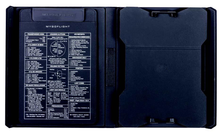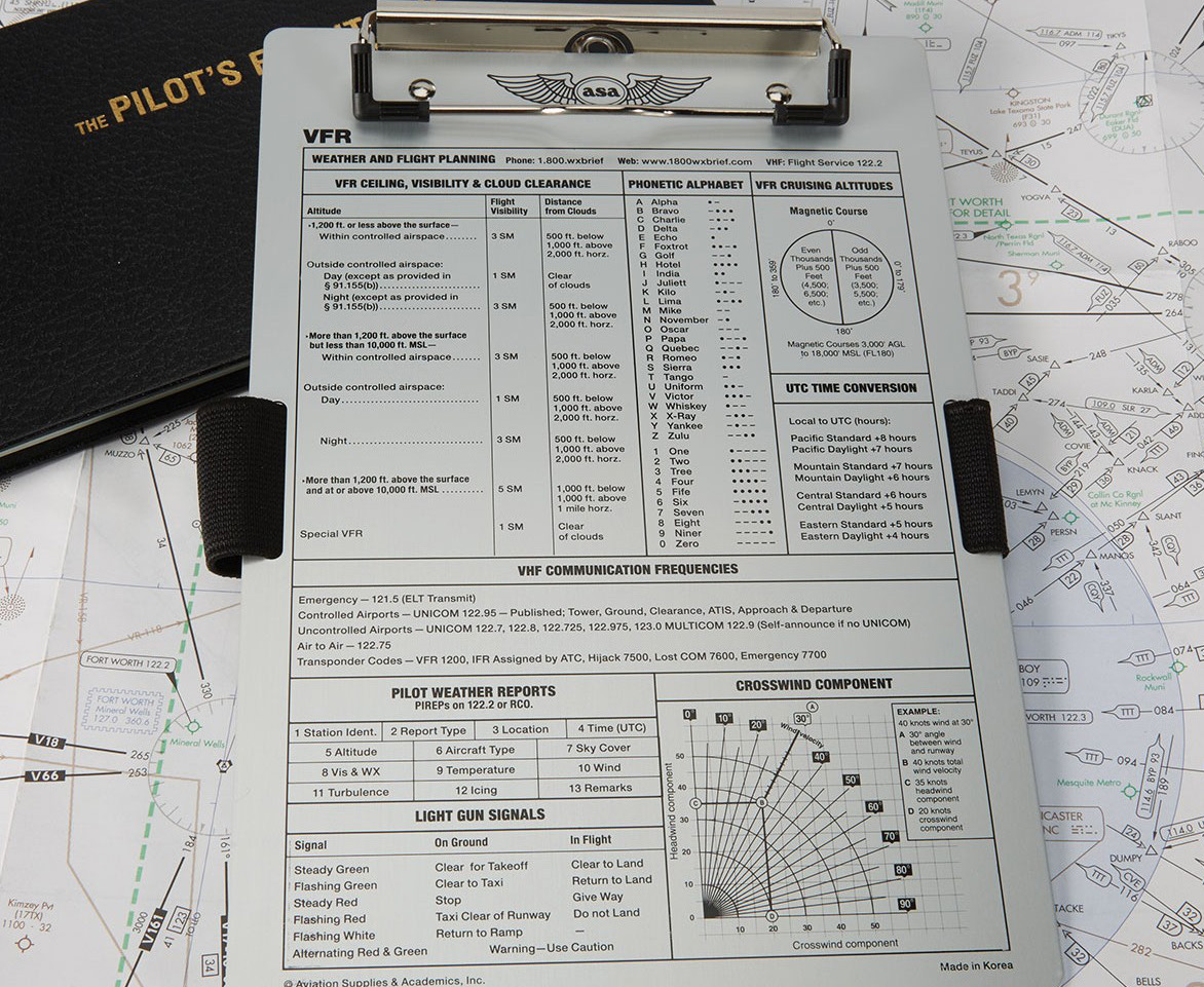 This brushed aluminum kneeboard is a great way to organize flight data and provides a strong surface for in-flight notetaking along with having permanent placards for information you need on a flight—like how to determine the angle and velocity of a crosswind at a glance or what those light gun signals mean. The kneeboard comes with wide elastic straps to keep it on your leg and holders for pens and pencils.